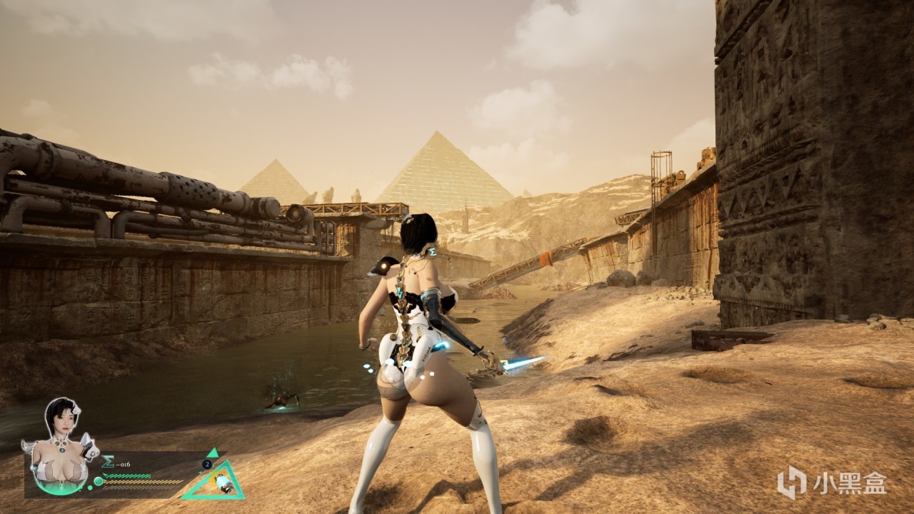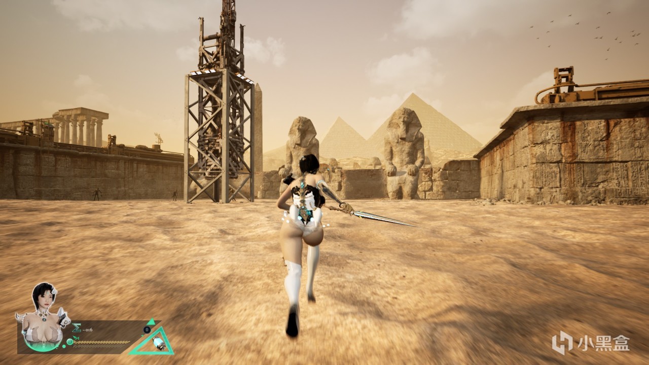 随后就可以开始冒险了,本作构建了一个广阔的世界,这里充满了未来世界破败后的没落感,到处都是残垣断壁,令人惊喜的是还有颇具神秘感的巨型金字塔和狮身人面像。