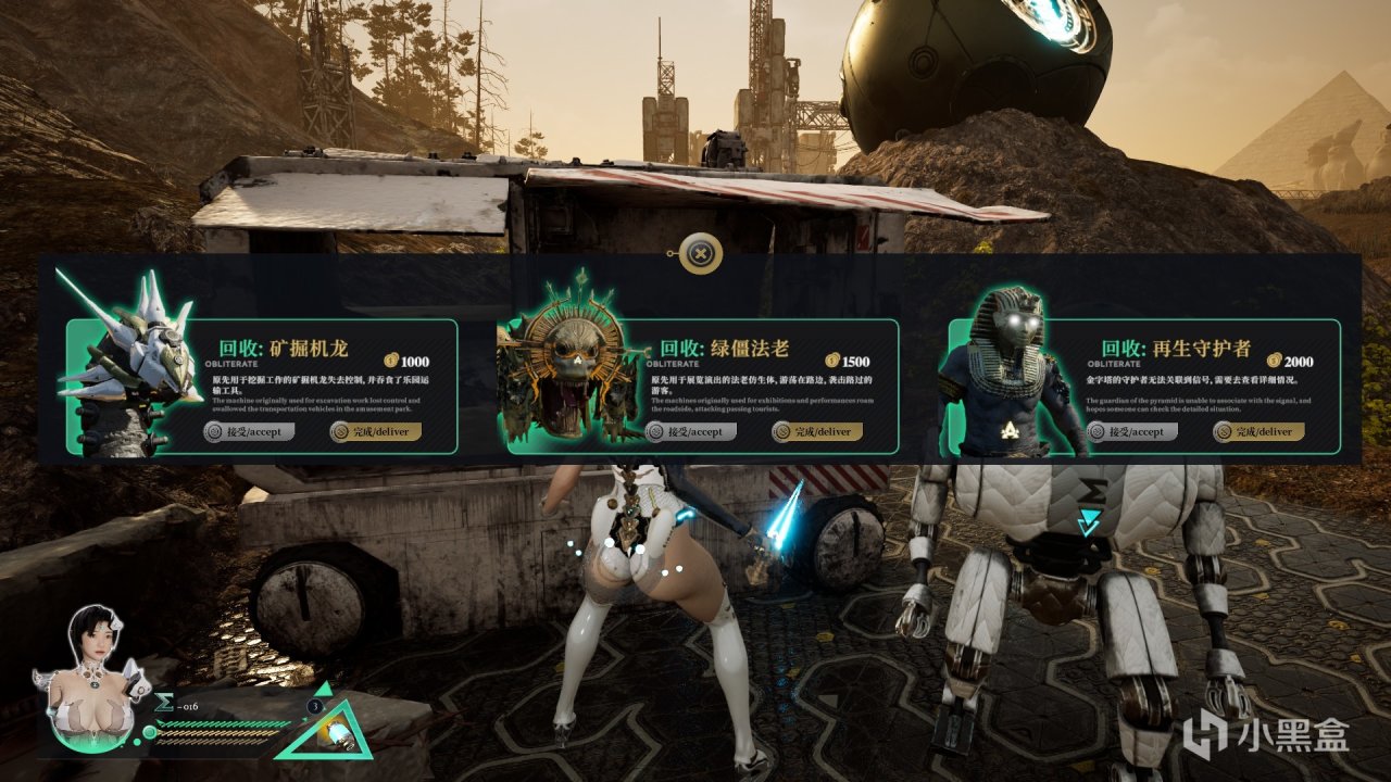 靠近第一个基地里的机器人NPC可以触发菜单,在这里可以接取3个任务,分别是回收矿掘巨龙、绿僵法老、再生守护者,也就是3个大Boss。