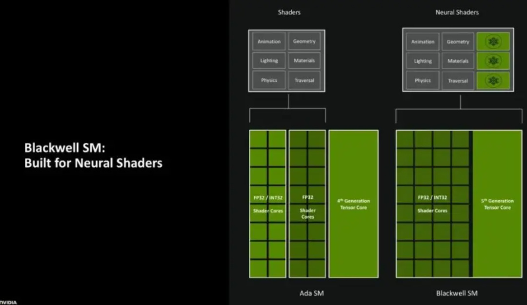 Blackwel架構GPU,SM單元更新爲Neural Shaders神經網絡着色器,也可以簡單理解爲AI着色,神經網絡材質與神經網絡貼圖壓縮可以減少計算資源和顯存開銷。