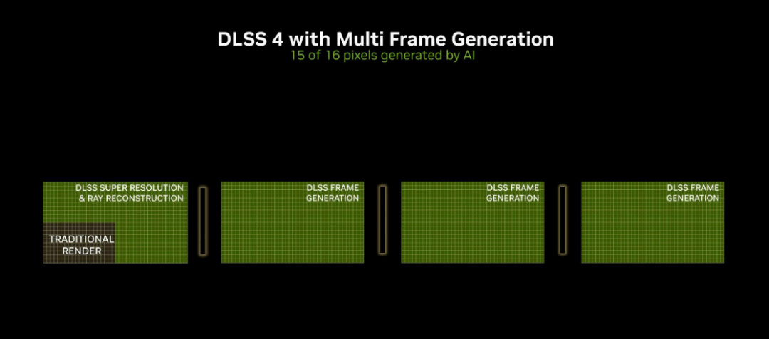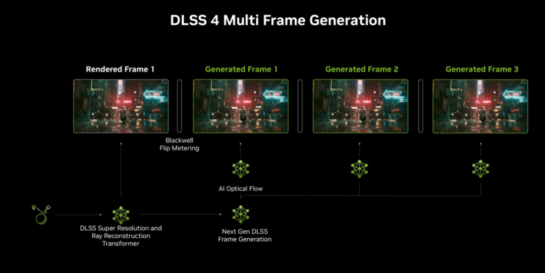 全新的DLSS 4多幀生成功能,利用AI可爲每個渲染幀額外生成最多3幀,從而進一步提升FPS幀數
