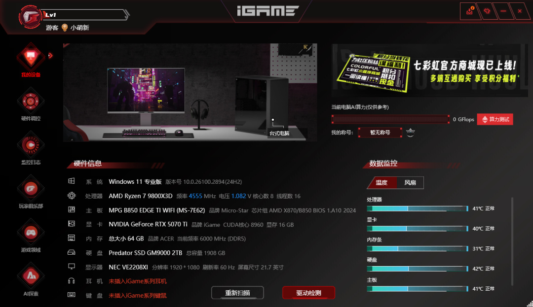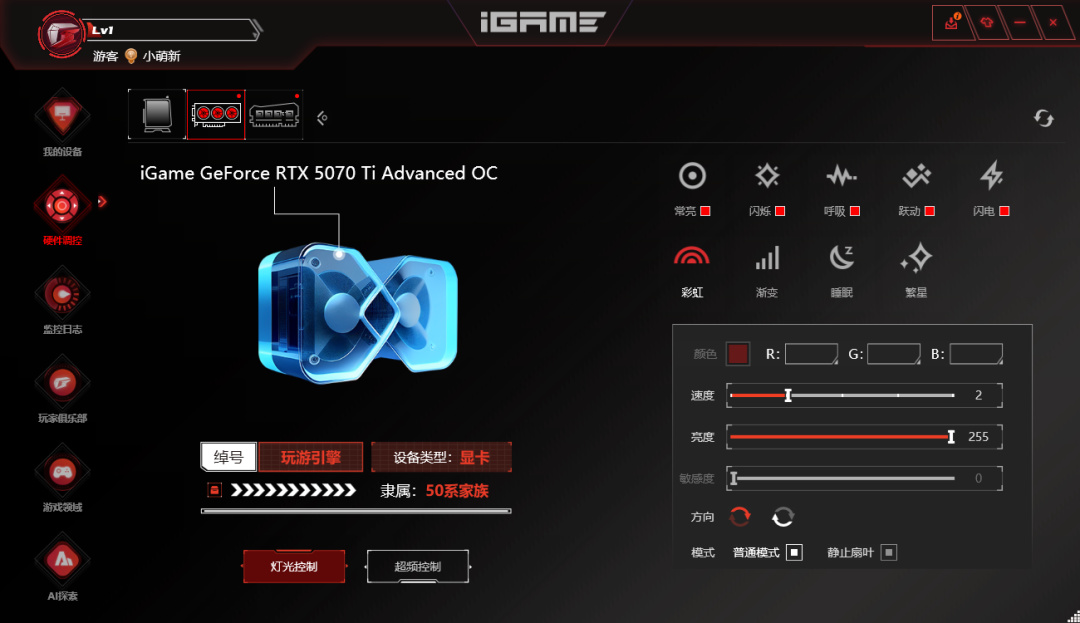 iGame Center軟件,支持顯卡的自定義燈光調節,顯卡風扇轉速 超頻調節。