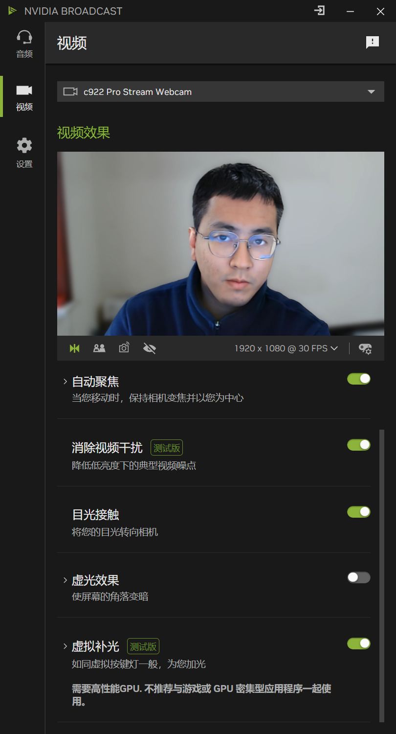 視頻效果,新功能消除視頻干擾,虛擬補光,可改善直播間的畫質和人像打光。