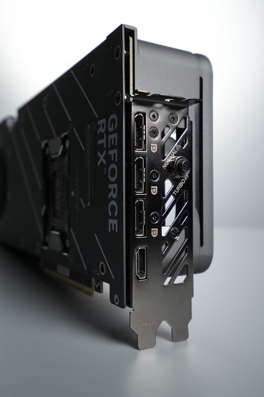 3個DP 2.1b+1個HDMI2.1b接口,視頻接口左上方的小按鈕可實現一鍵超頻。