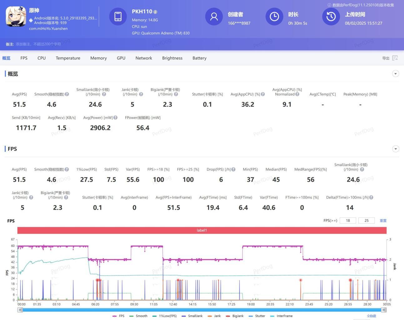 30分钟《原神》测试结束后,OPPO Find N5平均帧率51.5帧,中间出现了多次降频锁帧的情况,但胜在整体帧率表现稳定,没有出现影响游戏体验的严重波动。