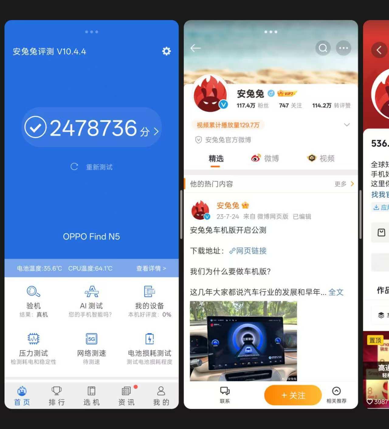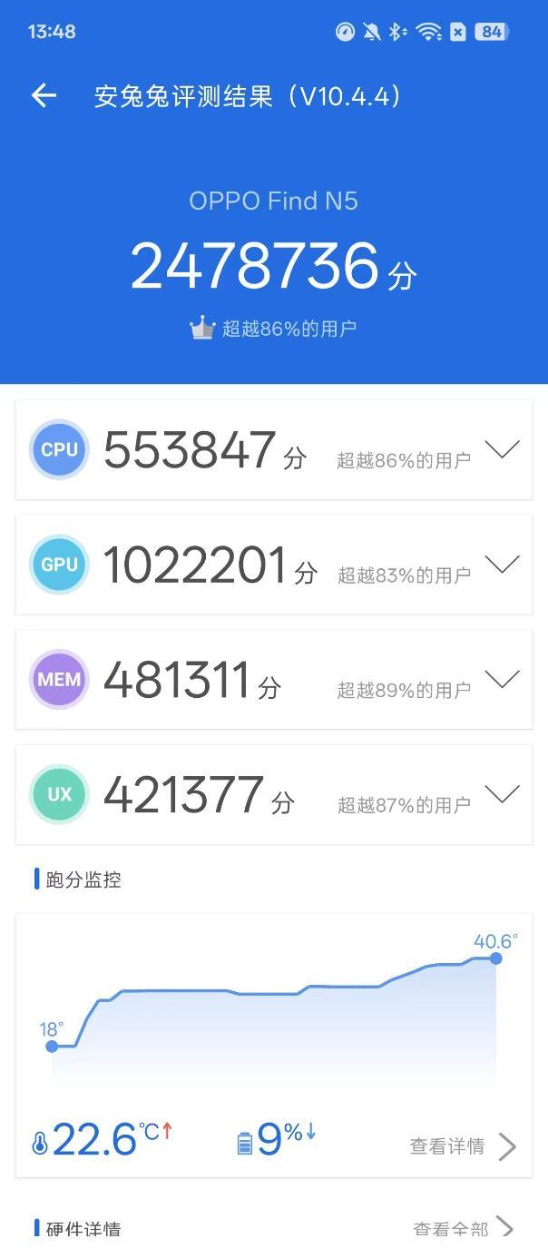 在安兔兔V10.4.4版本中,OPPO Find N5的跑分成绩为2478736分,其中CPU跑分553847分,GPU跑分1022201分,MEM跑分481311分,UX跑分421377分。
