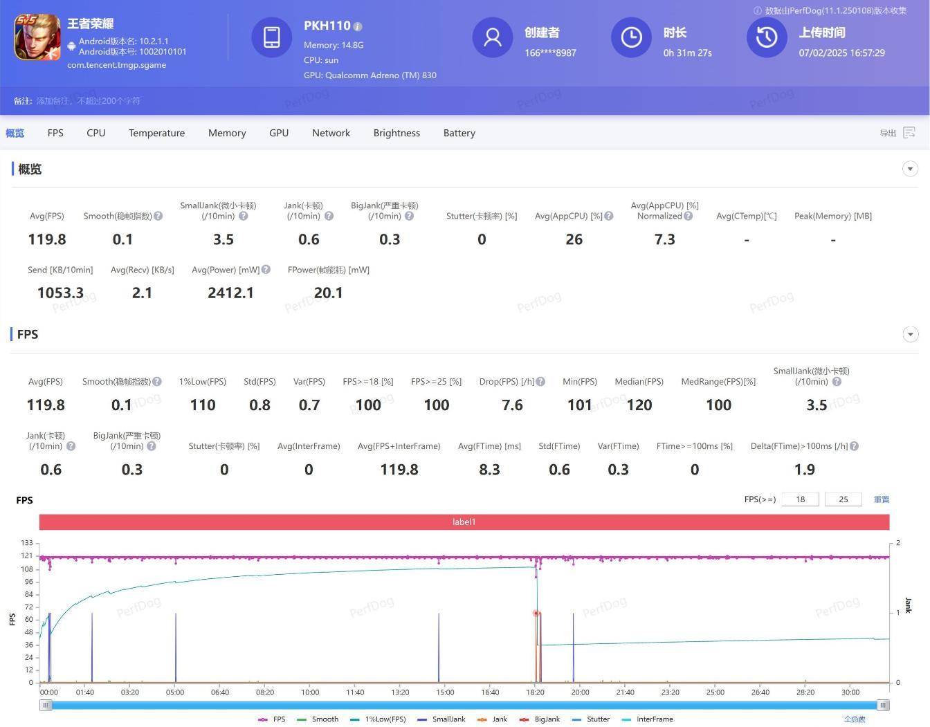 30分钟《王者荣耀》测试结束后,OPPO Find N5平均帧率119.8帧,全程没有出现明显的掉帧、卡顿等问题。