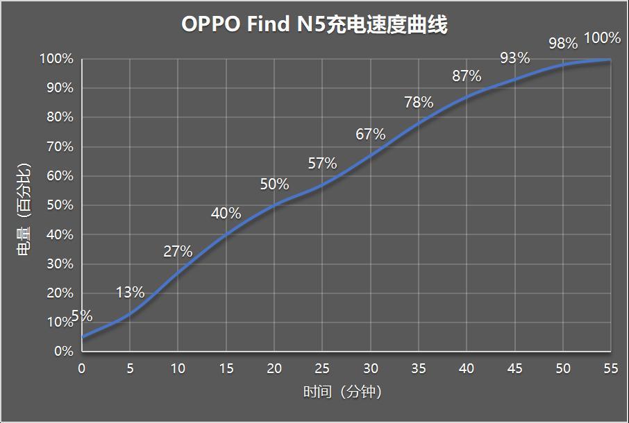 根据充电测试结果,可绘制OPPO Find N5充电速度曲线图如下: