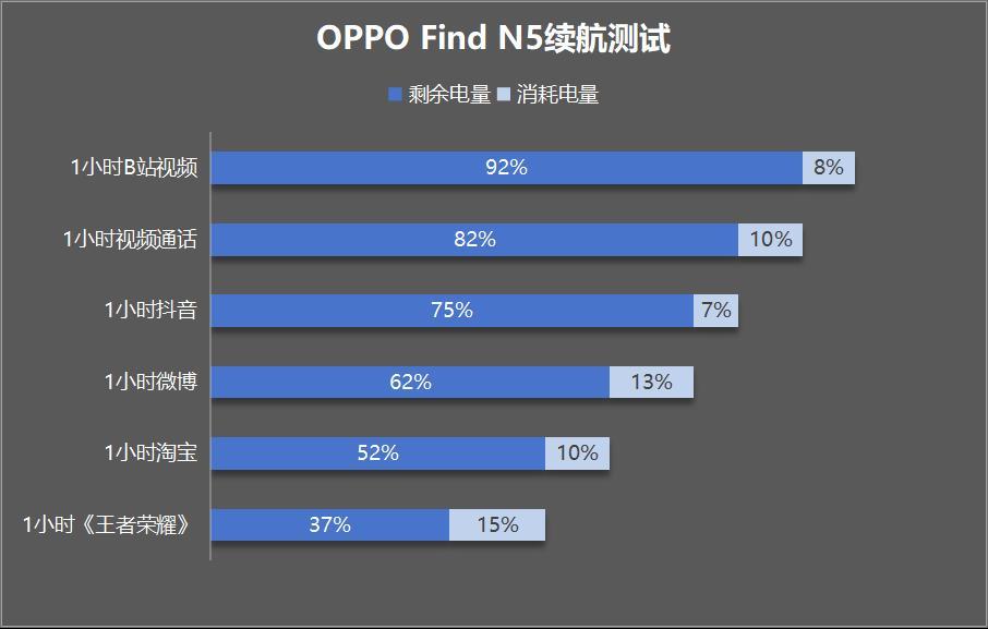 经实际测试,满电状态下,使用OPPO Find N5播放1小时B站视频,耗电8%;1小时视频通话,耗电10%;1小时抖音,耗电7%;1小时微博,耗电13%;1小时淘宝,耗电10%;1小时《王者荣耀》,耗电15%。