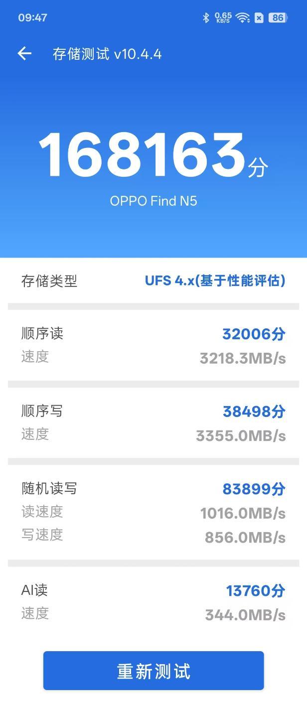 存储测试中,OPPO Find N5的总分为168163分,其中顺序读取3218.3MB/s,得分32006分;顺序写入3355.0MB/s,得分38498分;随机读取1016.0MB/s,随机写入856.0MB/s,得分83899分,AI读取速度344.0MB/s,得分13760分。