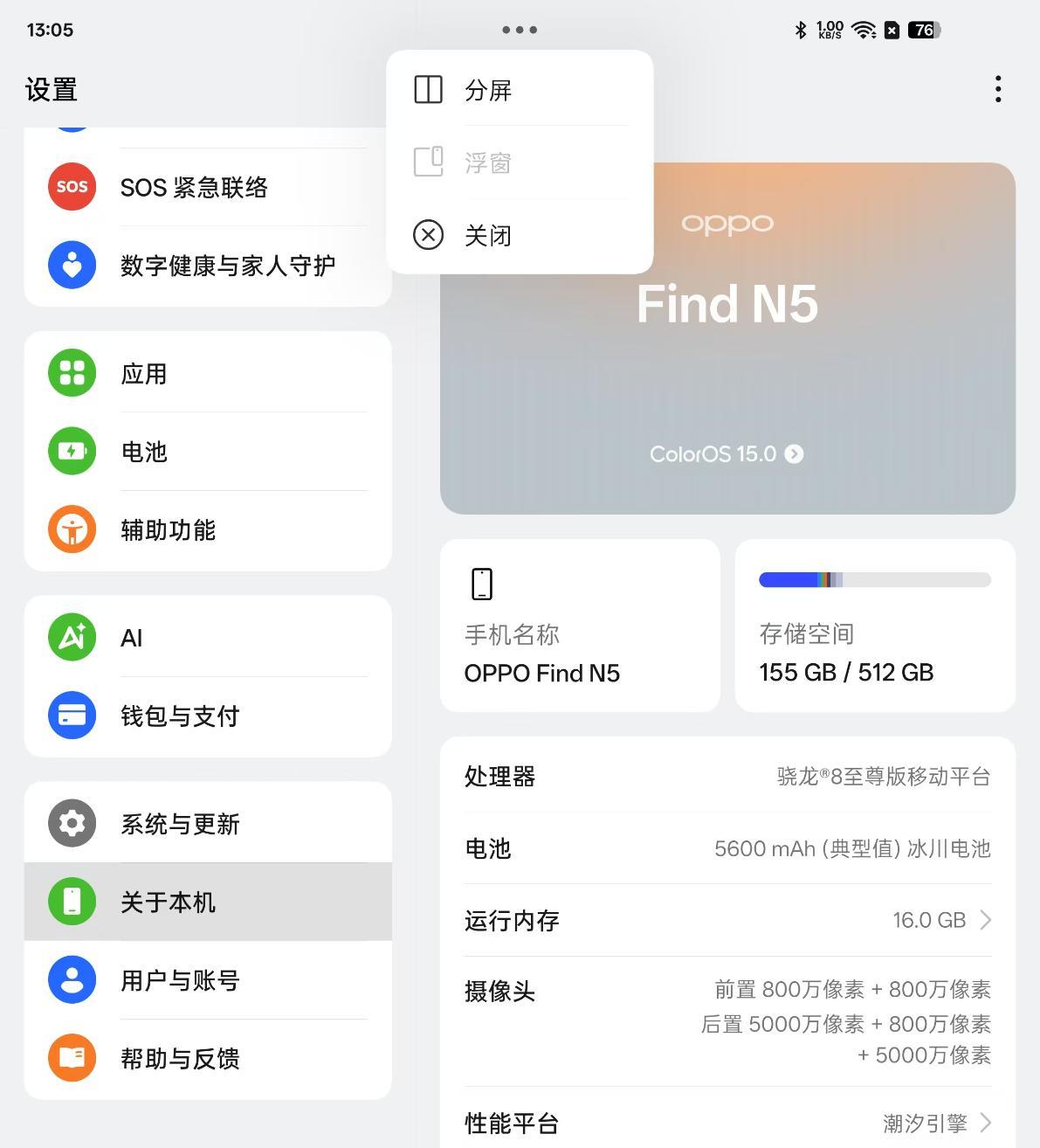 可以说,OPPO Find N5的系统有着大量针对折叠屏手机大尺寸主屏这一特点设计的功能。