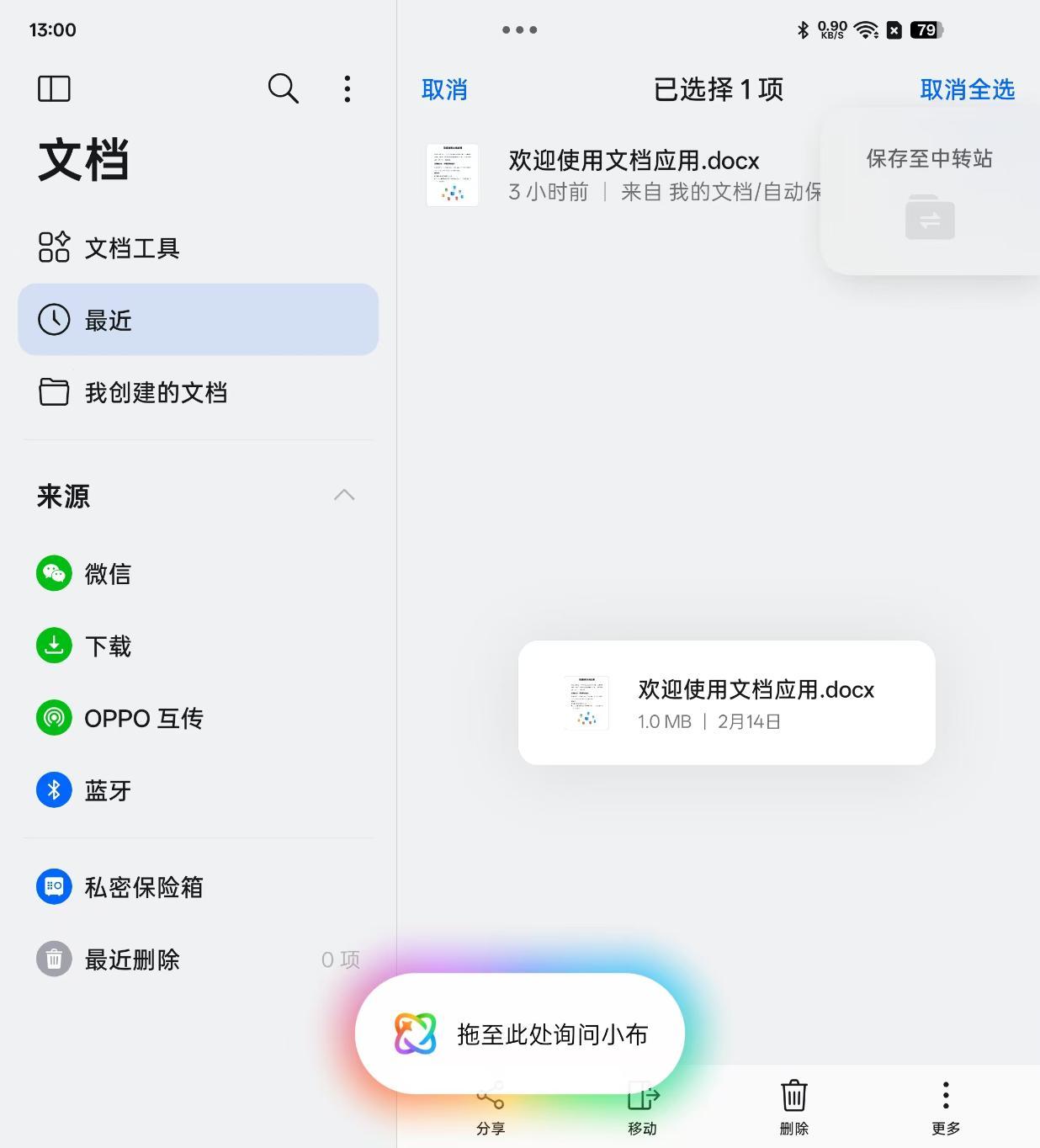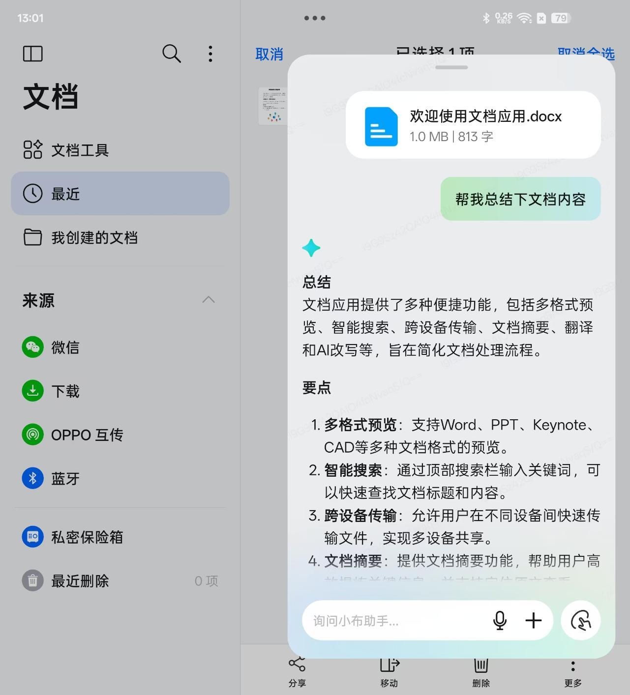 基于AI,用户能够将文档等文件直接长按“拖”给小布,从而让小布对文件内容进行总结整理。