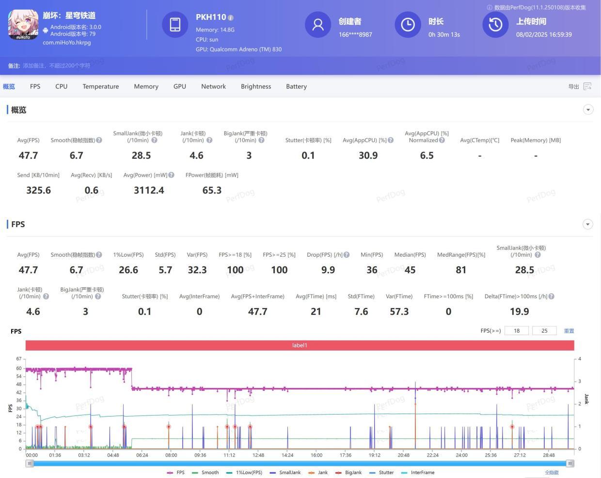 30分钟《崩坏:星穹铁道》测试结束后,OPPO Find N5平均帧率47.7帧,测试在进行至5分51秒时,帧率被锁在45帧,直到测试结束也没有恢复60帧运行。