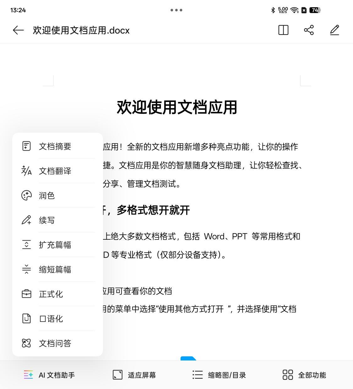 此外,AI还能够帮助完成包括文章润色、续写、扩展篇幅等一系列操作,让通过手机轻度办公真正实用化。