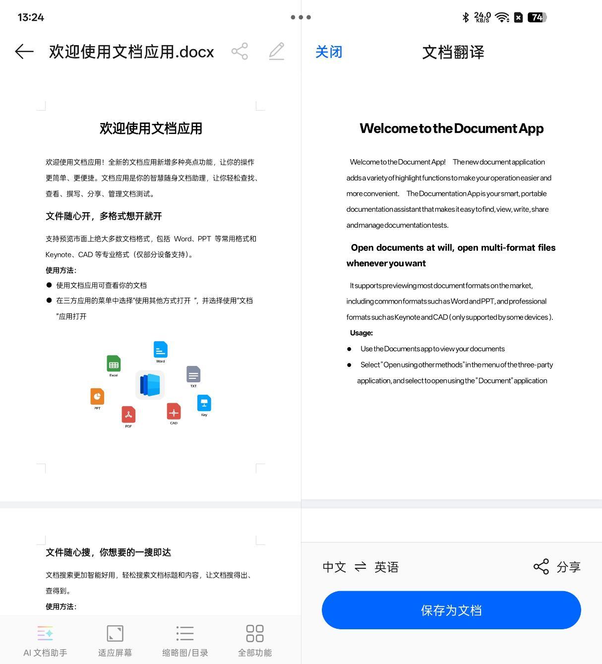 同时,AI能够帮助用户进行文档翻译,并借助OPPO Find N5的大屏优势,通过分屏的形式同步显示原文与译文,方便对照查看。