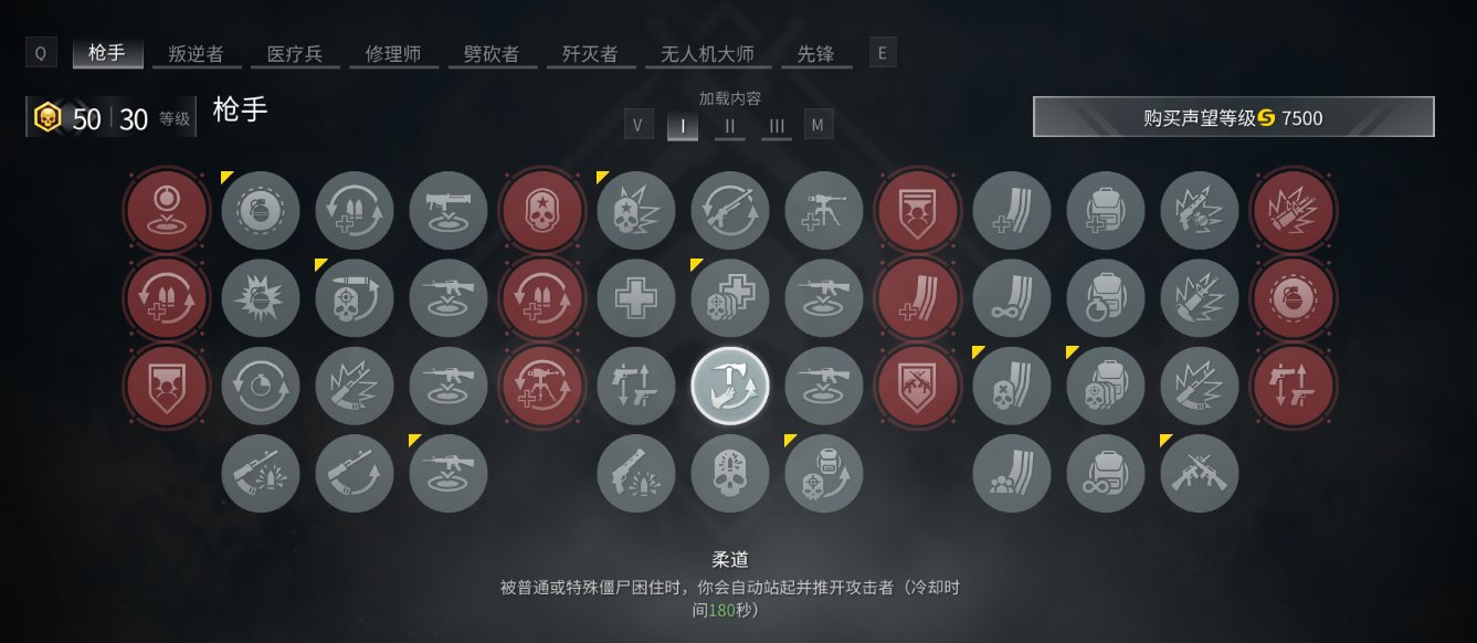 柔道:被殭屍壓制時可自行起身,但CD過長,且起身時並非全程無敵,實戰效果一般,不太推薦。