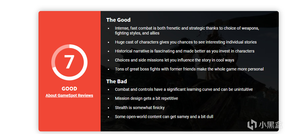 GS对于该游戏给出了7分,优点的话,就是内容庞大,故事吸引人,以及精彩的BOSS战,而缺点可能就是任务系统的重复度,以及开放世界固有的一些问题,像玩到后期会有点枯燥来着。不知道兄弟们感觉怎么样呢? 这里是永远都学不会心理学的小马同学,我们下期再见。