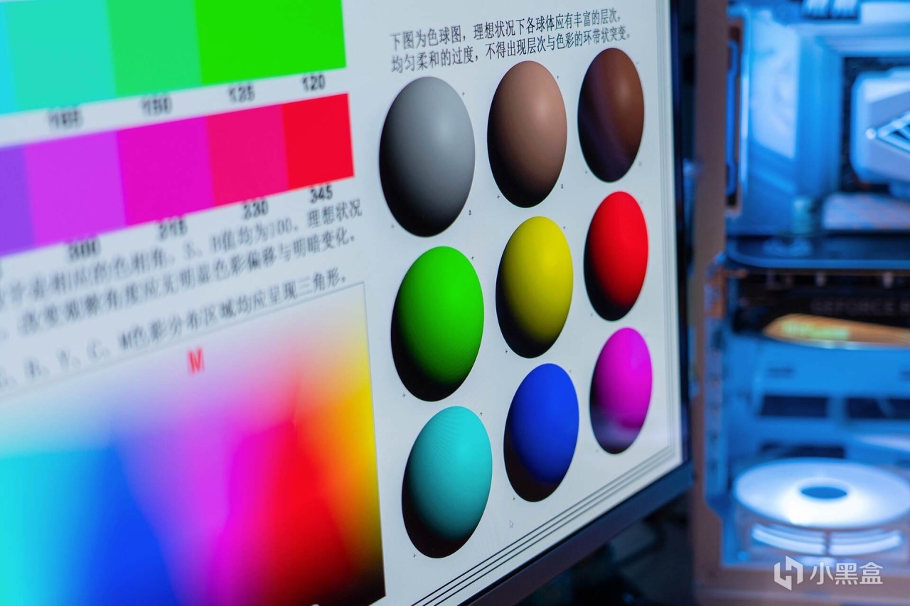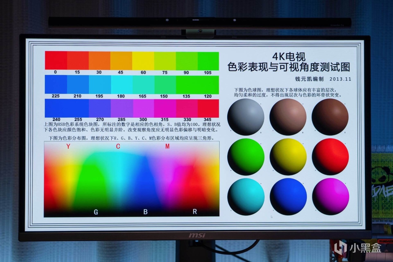 下图是检测显示器的色彩表现和可视角度的测试图,根据实际观察,在左上部分的HSB色彩系统色块图中,各色块颜色饱满,没有明显的色块并阶,改变观察角度也没有出现明显的变色、并阶。