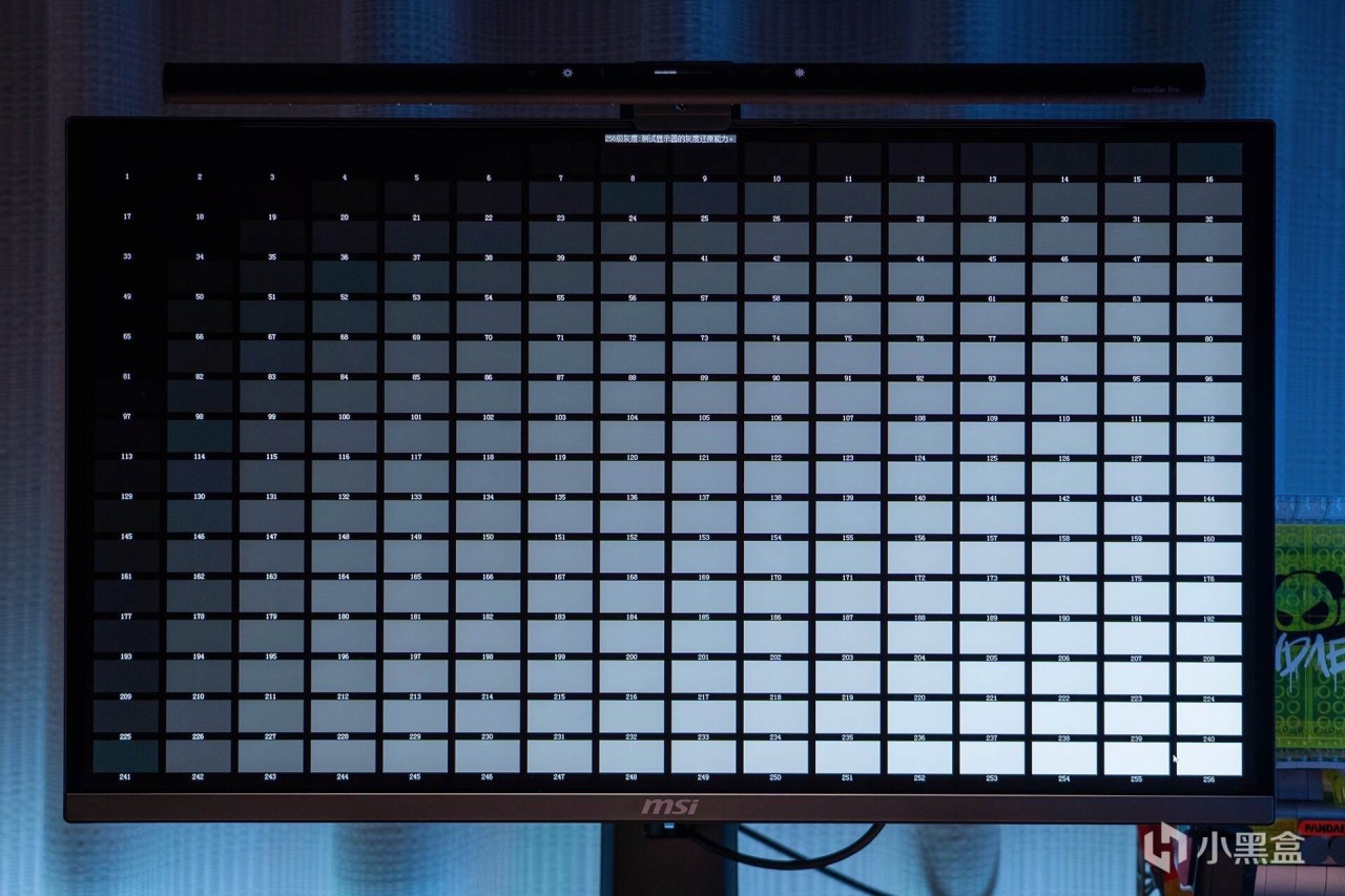 250级灰度表用来测试屏幕灰度还原能力。由于拍摄原因,深度灰显示与实际效果有些出入,实际显示是微星MPG 272URX QD-OLED的250级灰阶能显示到33,灰度还原能力非常出色。