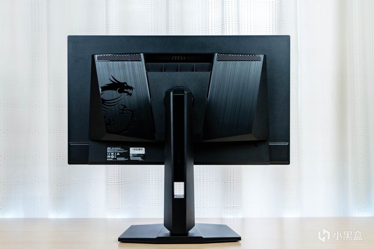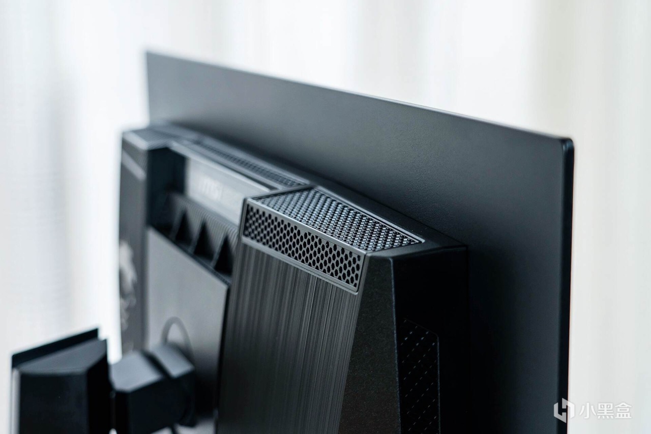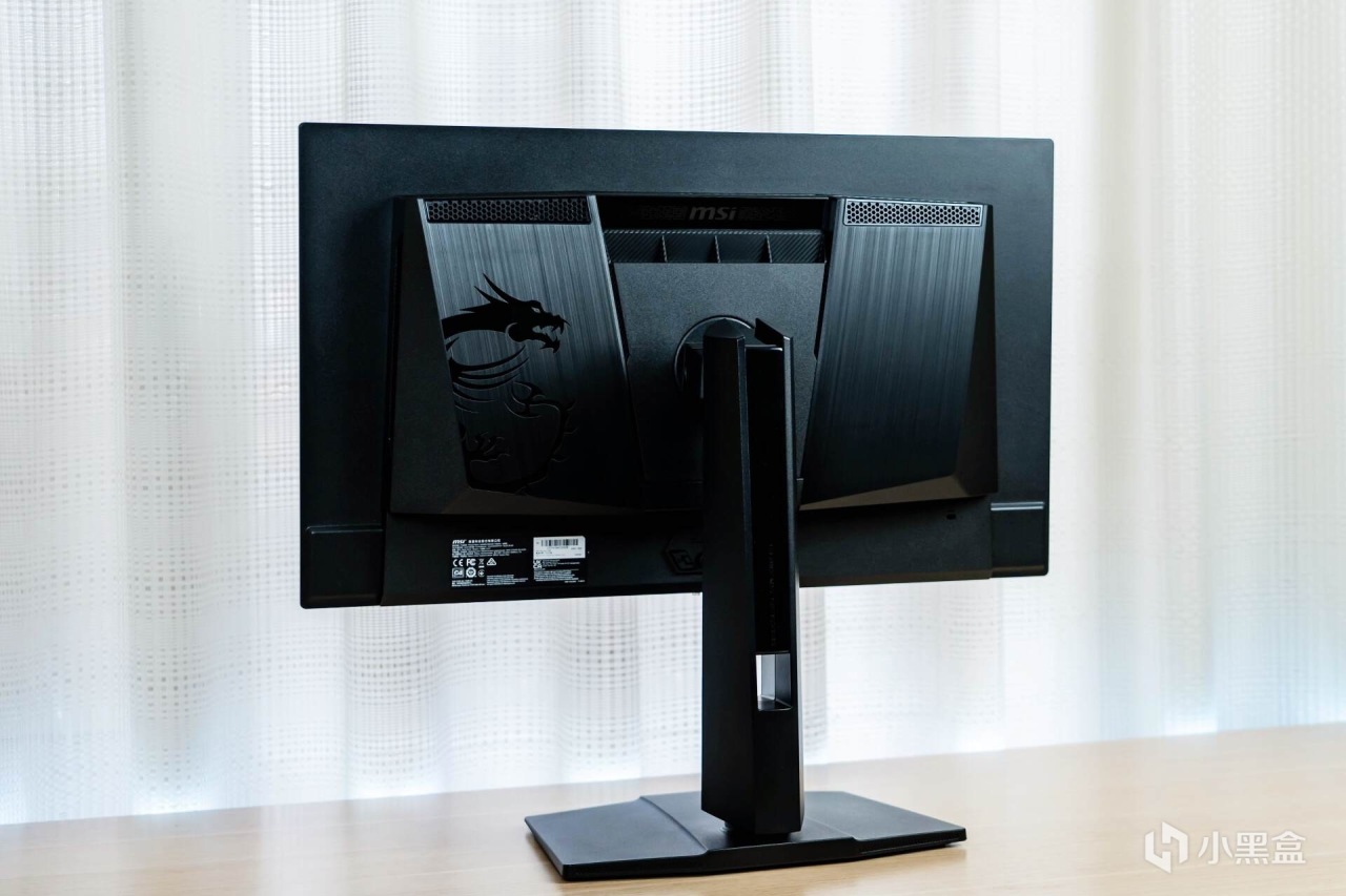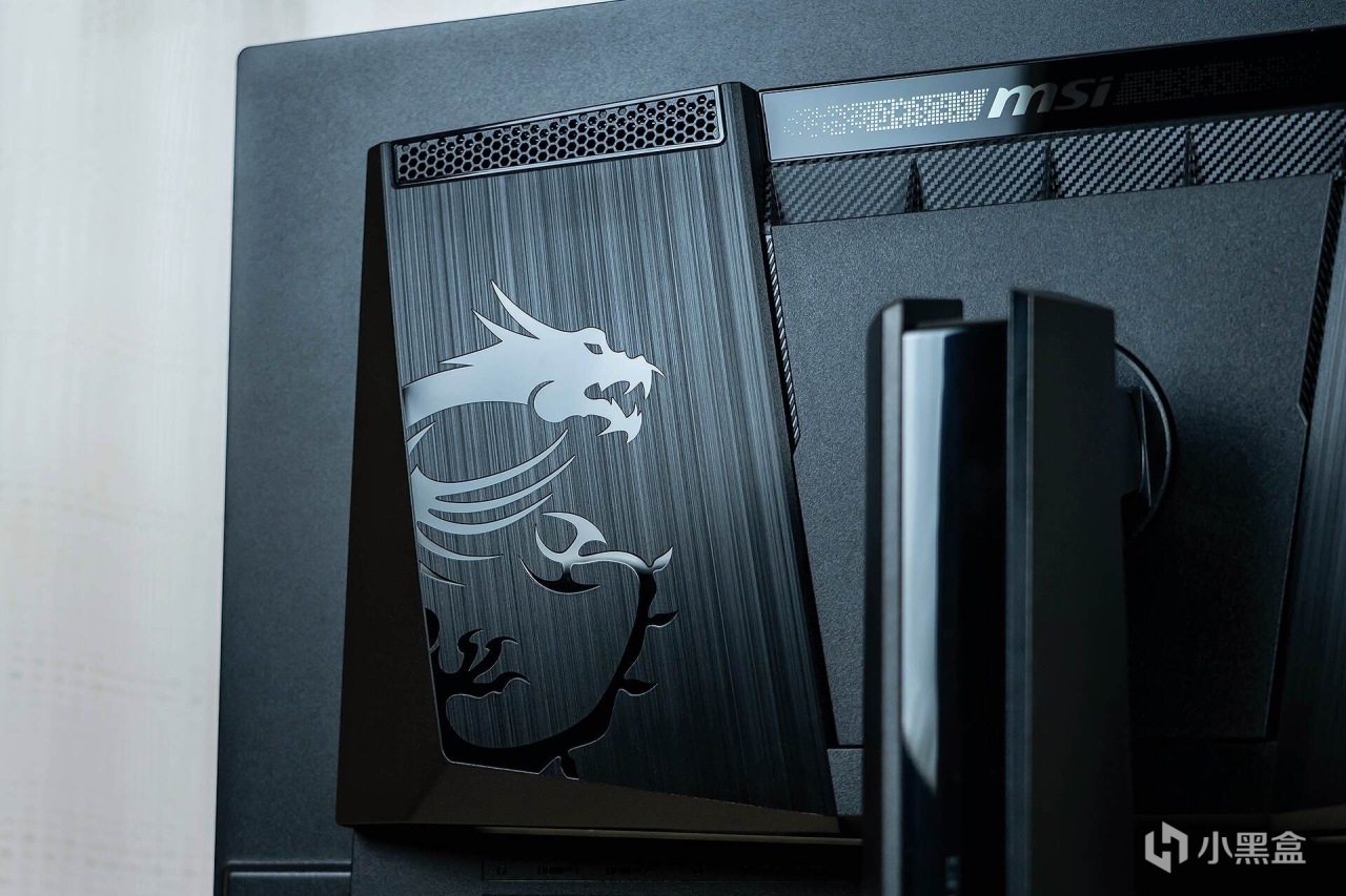 来到显示器的背部,霸气十足的“龙盾局”LOGO像一枚图腾一样盘踞在显示器的“肩膀”之上,辨识度很高;“肩膀”处是两块金属拉丝工艺的面板,质感十足,让显示器散发出一股凌厉的电竞气息。