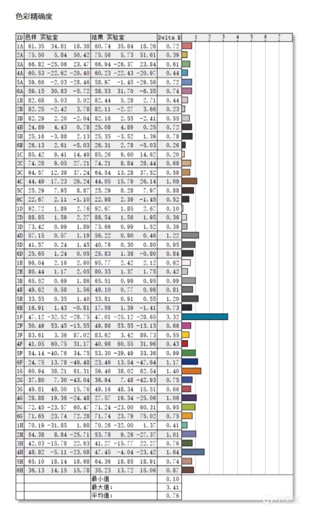 一台显示器的显示效果除了色域覆盖(色彩丰富程度)的影响,还受对颜色还原的精准度影响,它的衡量标准用ΔE表示,数值越小表示显示器对该颜色的还原越精准(ΔE<2就已经达到专业设计显示器的标准)。微星MPG 272URX QD-OLED的色准出乎意料的好,48色ΔE平均值0.76,最小值0.10。