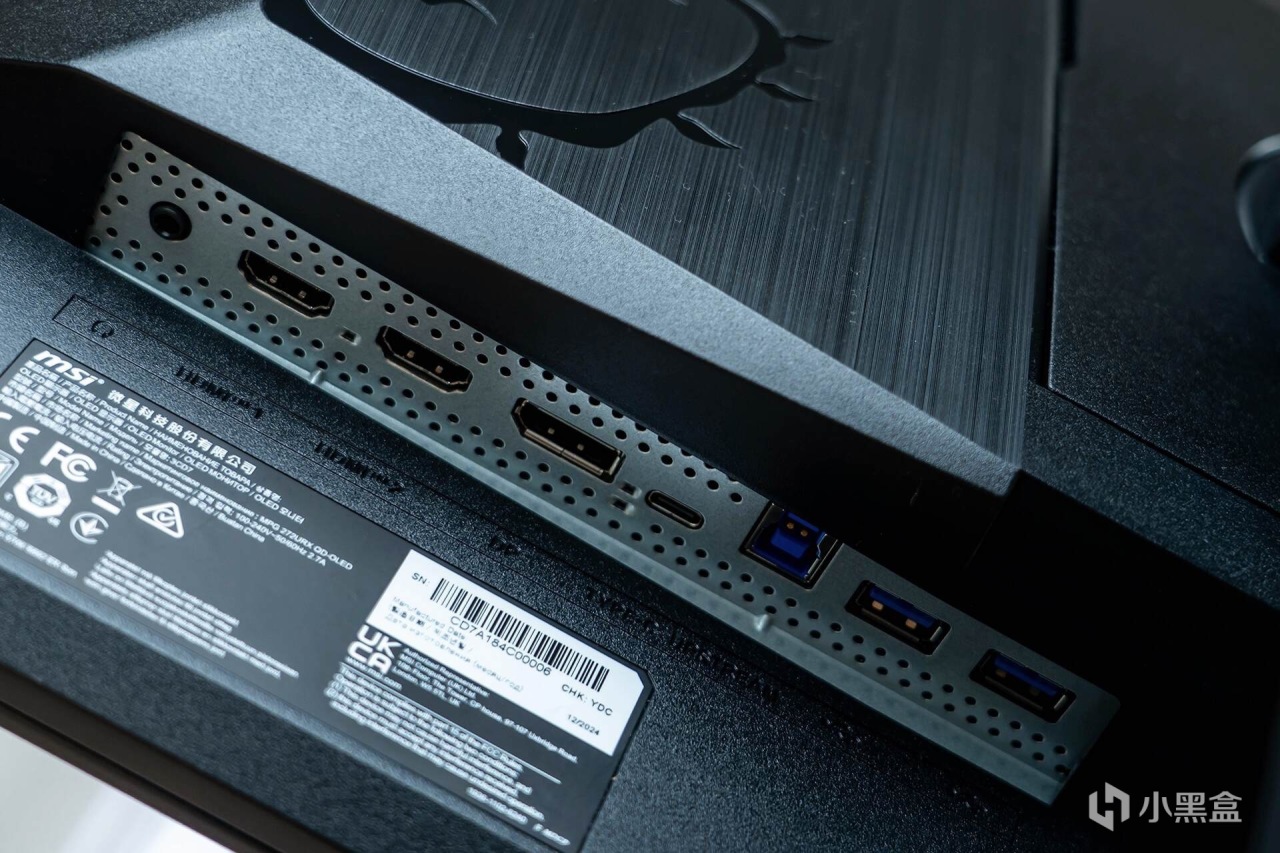 微星MPG 272URX QD-OLED有丰富的I/O接口,从左往右依次为:3.5mm音频接口、HDMI2.1接口x2(支持4K@240Hz)、DP2.1接口(支持4K@240Hz)、USB Type-C接口(最高支持98W PD充电)、USB Type-B上行端口、USB Type-A接口x2,这些接口能轻松满足大多数用户的使用需求。