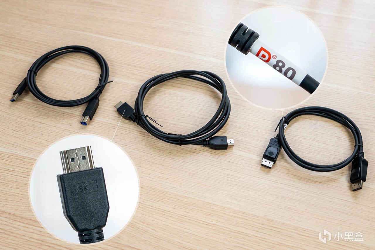 配件附带的3条线材,1条HDMI 2.1视频线、1条DP 2.1视频线和1条USB Type-B to A上行数据线,其中,DP线的一头有“DP80”标签,表示最高支持80Gbps的总带宽,HDMI线标有“8K”标识,标识最高支持8K分辨率。我这条DP线长度1米,据说后续会改成1.5米的线。
