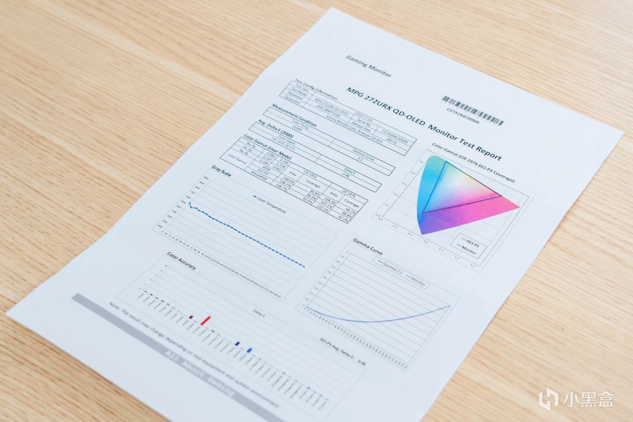 为了方便用户更客观的了解这台显示器的屏幕素质,在附件中给出了一份出厂校色报告。从这份报告中可以看出,微星MPG 272URX QD-OLED的色域覆盖、屏幕亮度、色彩精准度等参数可圈可点,非常优秀。