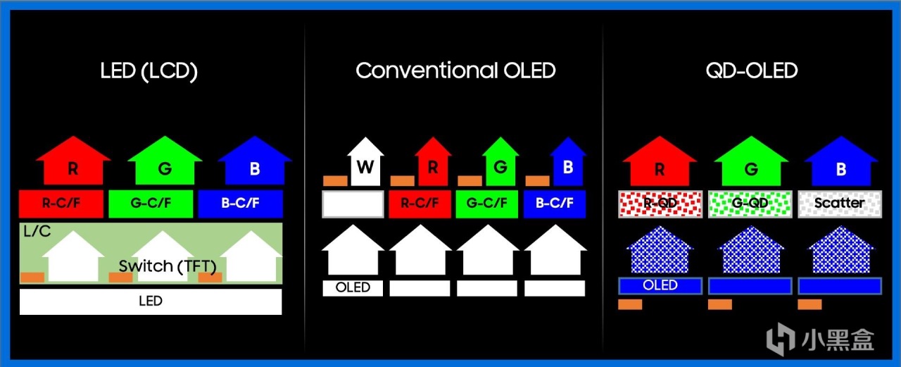 “QD”表示“量子点”,三星QD-OLED是将量子点技术与自发光OLED技术相结合,OLED层像素级输出高纯度蓝光,然后通过QD量子点层直接激发出高纯度红光和绿光,最后混合成每个像素所需要的颜色进行成像。这个过程中没有能量损失,因此QD-OLED面板理论上可以显示比传统OLED面板更高的亮度和更艳丽的色彩。