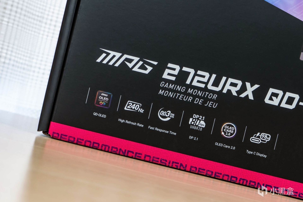 除了常规的品牌与型号信息,包装箱的左下角展示了这台显示器的几条重要信息:QD-OLED、240Hz高刷、0.03ms GTG响应、DP 2.1 UHBR2.0接口、OLED Care2.0以及最高支持98W快充等。