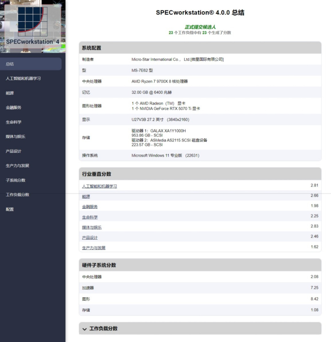SPECworkstation® 4.0.0是SPEC最新發布的硬件生產力測試,這套測試軟件可以測試出CPU、顯卡等硬件在應對AI人工智能、能源、金融、設計、傳媒等不同行業生產力需求時,可以帶來多少性能表現。經過測試,這套以RTX 5070Ti魔刃OC顯卡爲核心的平臺,在AI人工智能與深度學習行業軟件測試中得分2.81分,在能源行業軟件測試中得分2.66分,在金融行業軟件測試中得分1.98分,在生命科學行業軟件測試中得分2.25分,在媒體娛樂行業軟件測試中得分2.83分,在產品設計行業軟件測試中得分2.46分,在生產力與發展行業軟件測試中得分1.62分;