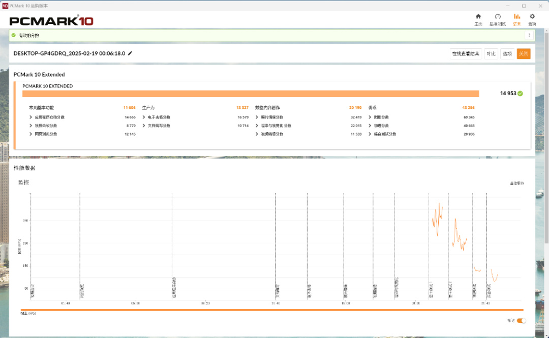 PC Mark Extended整機測試,整機得分14953分,常用基本功能測試得分測試11606分,生產力得分13327分,數位內容創作得分20190分,遊戲得分43256分;
