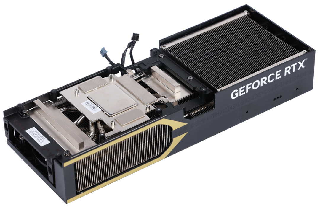 正面3把風扇均爲90mm的全新霜環風扇,整體爲環形鏈結構,扇葉共7片,均呈曲面三折角狀,散熱效能和噪音控制均優於上代。同時,也支持智能啓停。散熱模組共配置了共4根Φ6mm鍍鎳複合熱管,無均熱板。