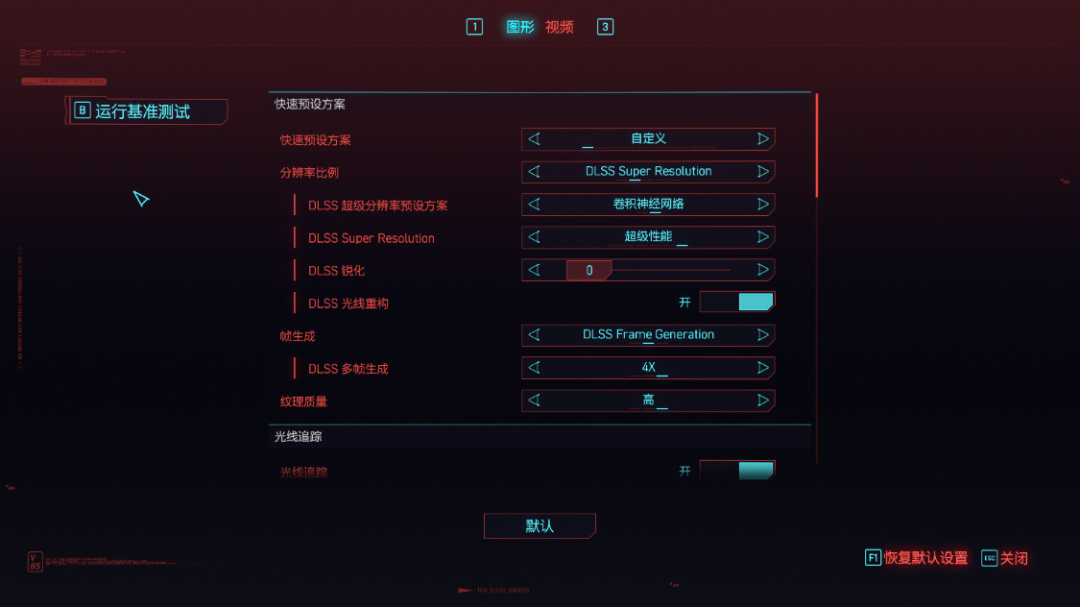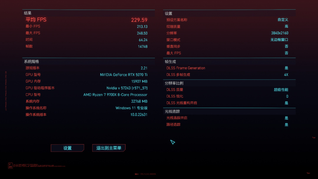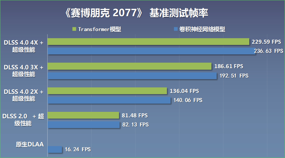 《賽博朋克2077》基準測試中,將畫質設爲超級,光追設爲路徑追蹤模式,4K分辨率下,開啓原生DLAA時,遊戲平均幀率爲16.24 FPS。開啓DLSS 2.0,並設爲超級性能模式,在使用卷積神經網絡模型時,遊戲平均幀率爲82.13 FPS。在使用Transformer模型時,遊戲平均幀率爲81.48 FPS。開啓DLSS 幀生成,並將多幀生成倍率設爲2X,在使用卷積神經網絡模型時,遊戲平均幀率爲140.06 FPS。在使用Transformer模型時,遊戲平均幀率爲136.04 FPS。將多幀生成倍率設爲3X後,在使用卷積神經網絡模型時,遊戲平均幀率爲192.51 FPS。在使用Transformer模型時,遊戲平均幀率爲186.61 FPS。將多幀生成倍率設爲4X後,在使用卷積神經網絡模型時,遊戲平均幀率爲236.63 FPS。在使用Transformer模型時,遊戲平均幀率爲229.59 FPS。