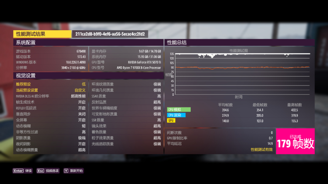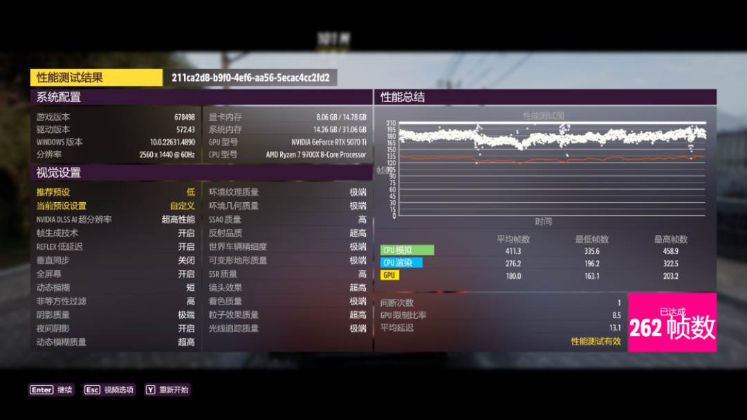 《極限競速·地平線5》基準測試,極端畫質,極端光追,開啓DLSS 3.0並設爲超級性能模式,4K分辨率下,遊戲平均幀數179FPS。2K分辨率下,遊戲平均幀數262FPS;