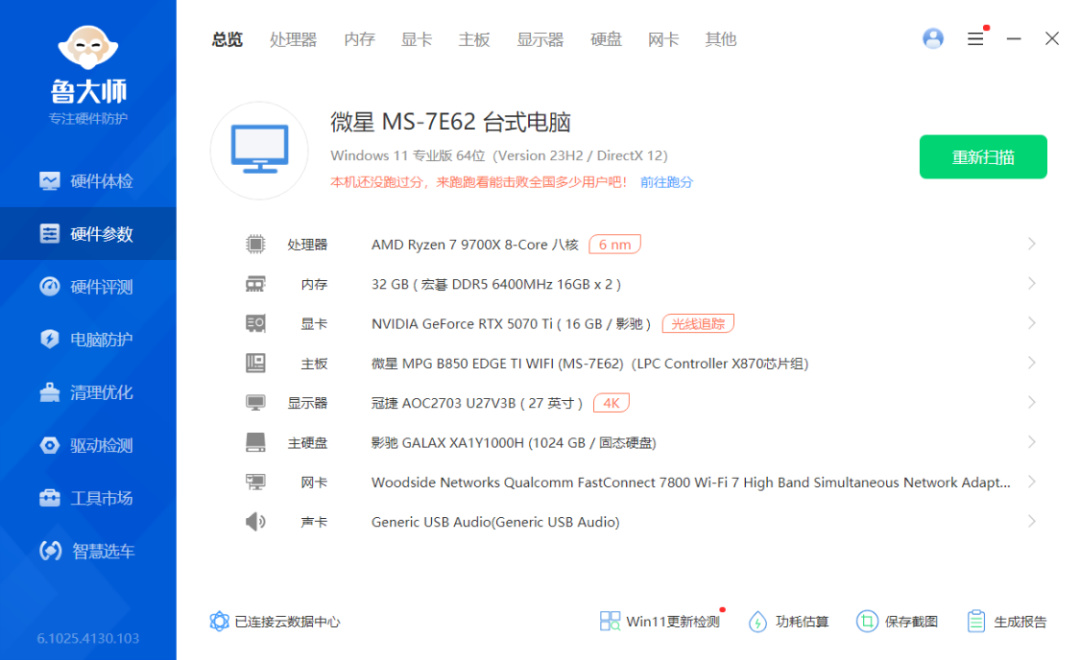 完整配置單:AMD R7-9700X處理器、微星MPG B850 EDGE TI WIFI主板、影馳RTX 5070Ti 魔刃OC顯卡、宏碁掠奪者Hera影鋒D5-6400MHz C30冰戟銀16G*2內存、影馳星曜7000Plus 1T M.2固態硬盤、影馳金屬大師暗衛黑色機箱、影馳星曜G360 黑色一體式水冷、安耐美GM850 白色金牌全模組電源、影馳夢境Pro 黑色散熱風扇*5(4反 + 1正)