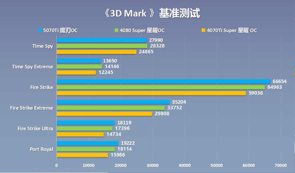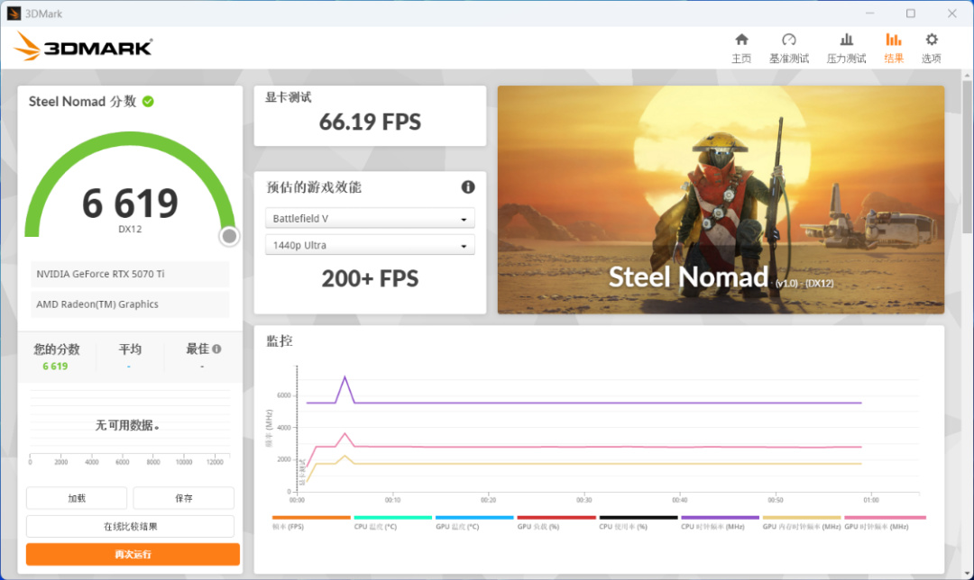 Steel Nomad基準測試可以測試出電腦在4K分辨率下,遊玩非光追遊戲時的性能表現。RTX 5070Ti魔刃OC 顯卡得分爲6619分;