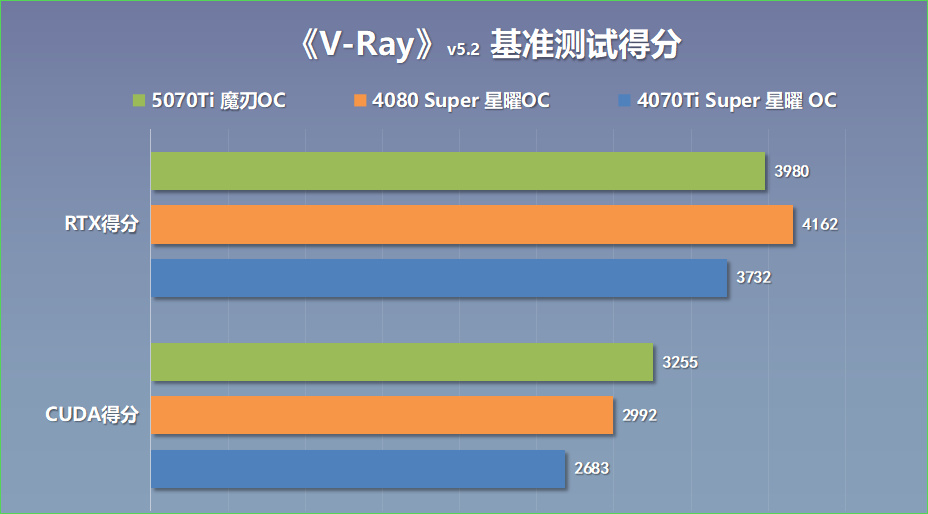 V-Ray作爲目前主流的3D渲染插件,廣泛應用於建築、廣告、電影電視等行業在進行視覺特效製作的過程中,該插件可以測試顯卡在渲染實時光追以及特效渲染速度的性能。RTX 5070Ti魔刃OC 顯卡在CUDA渲染測試中,得分爲3255分,RTX光追渲染測試得分3980分;