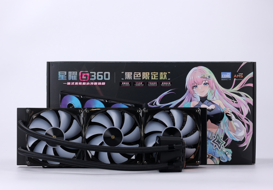 散熱方面,今天推薦的是帶屏的星曜G360 黑色限定款一體式水冷。冷頭內置的2.4寸24位IPS全視角屏幕,可以通過水冷配套的軟件將圖片/GIF動畫/MP4格式視頻在冷頭的屏幕上展示。性能方面採用三相九極高速馬達方案,能夠提供3000R澎湃動力。同時搭配改進款仿生型葉輪,高密度低水阻S型散熱鰭片更大的散熱面積,確保實現優秀的解熱性能。