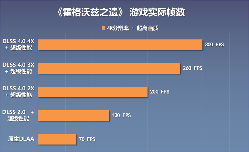 《霍格沃茲之遺》實際遊玩體驗,將畫質設爲超高,4K分辨率下,開啓原生DLAA時,遊戲實際幀率爲70FPS左右,開啓DLSS 2.0後,遊戲實際幀率爲130FPS左右,開啓DLSS幀生成,並將生成倍率設爲2X,遊戲實際幀率爲200FPS左右,將生成倍率設爲3X,遊戲實際幀率爲260FPS左右,將生成倍率設爲4X,遊戲實際幀率爲300FPS左右;