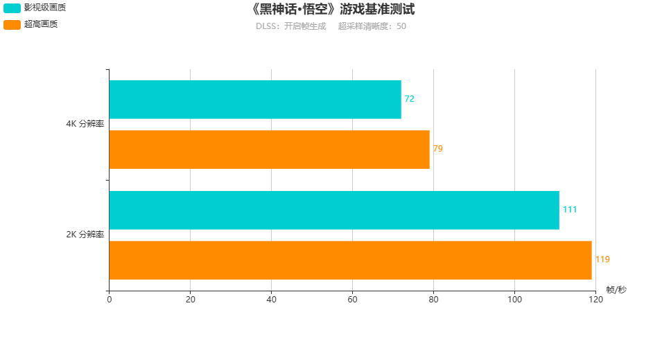 而在尚未開放支持DLSS 4.0的《黑神話悟空》遊戲基準測試中,超高光追,開啓DLSS 3.0,並將超採樣清晰度設爲50,4K分辨率下,在畫質爲影視級時,遊戲平均幀數爲72幀/秒,在畫質爲超高時,遊戲平均幀數爲79幀/秒。2K分辨率下,在畫質爲影視級時,遊戲平均幀數爲111幀/秒,在畫質爲超高時,遊戲平均幀數爲119幀/秒;