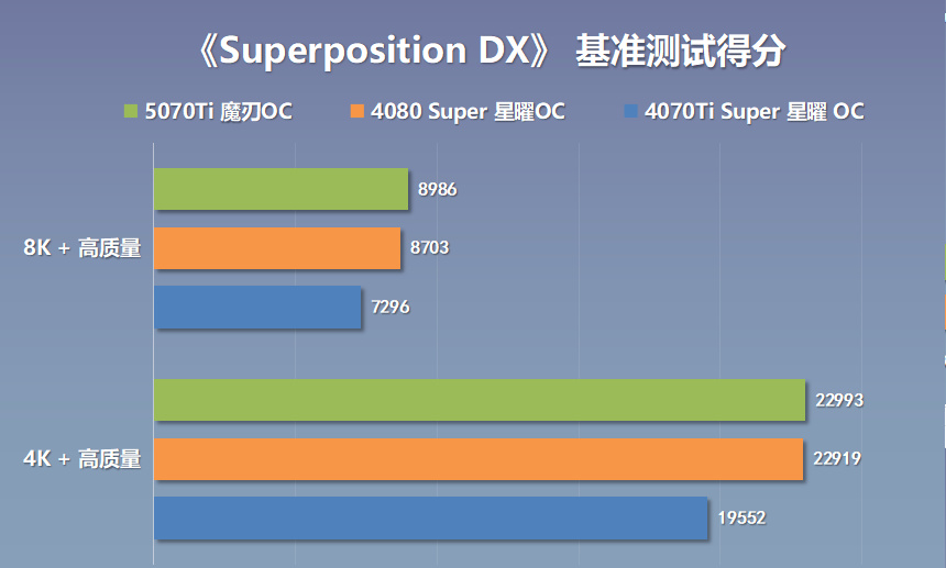 對比傳統渲染測試項目來說,Superposition DX基準測試可以測試出攝像機在3D場景裏移動時,顯卡實時渲染物品運動、光影和材質等模型的渲染速度與質量。而顯卡在渲染4K分辨率下,最高質量的場景時,得分22993分,在渲染8K分辨率下,最高質量的場景時,得分8986分;