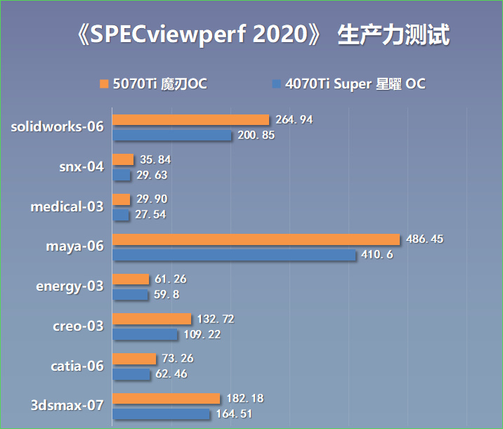 而在稍早版本的SPECviewperf 2020測試中,RTX 5070Ti顯卡在SolidWorks、3DS MAX、MAYA等生產力也均領先於上代4070Ti的性能表現;