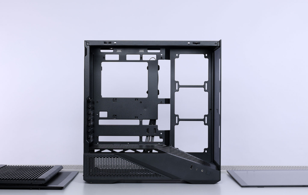機箱採用模塊化設計,左右側板+頂板+前板均四面支持快拆,對玩家裝機都非常友好。電源倉設計也極具辨識度,斜切網孔面板搭配ABS塑料面板,彰顯了幾何美學的魅力。機箱兼容性優秀,最大支持ATX主板,並支持背插的ATX和M-ATX主板;顯卡安裝限長達400mm,風冷安裝限高180mm,支持頂置360冷排和側裝240冷排,至多可以同時安裝8把12cm規格風扇,搭配機箱箱體的大量散熱網孔,散熱效能直接拉滿。