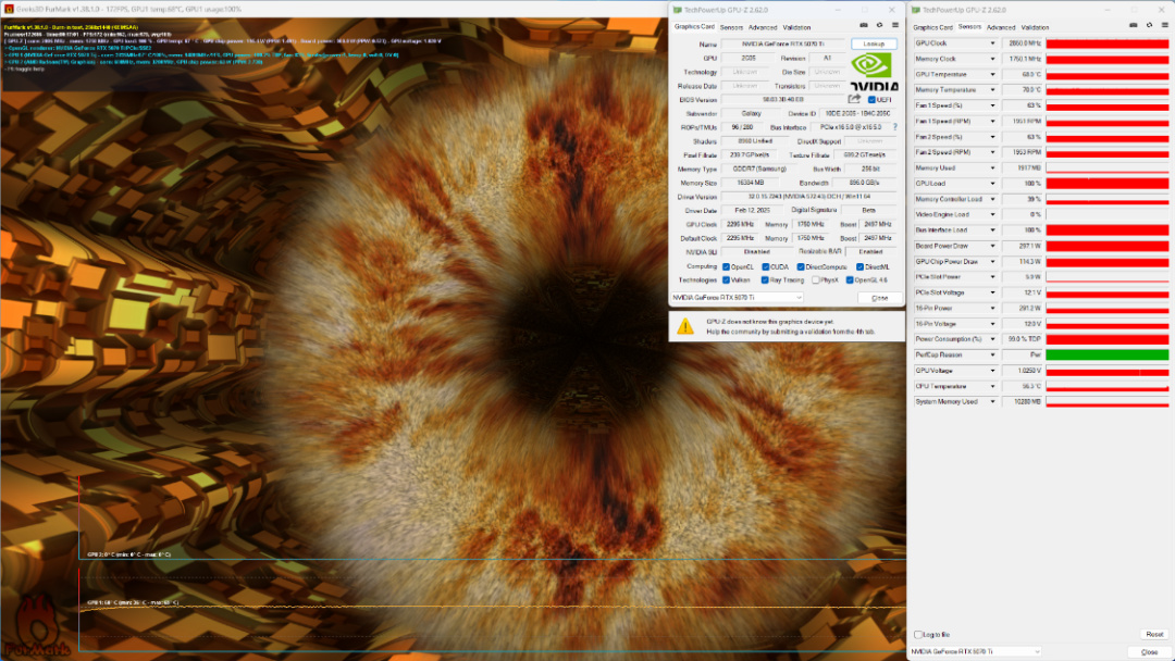 FurMark烤機測試,室溫24°,機箱內環境,烤機15Min後,顯卡功耗300W左右,顯卡溫度68°左右;