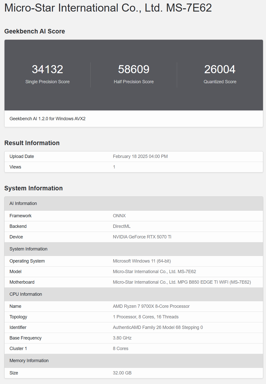 目前Stable Diffusion暫不支持50系顯卡,因此使用GeekBench推出的GeekBench AI基準測試,測試顯卡的AI性能,RTX 5070Ti魔刃OC 顯卡在單精度測試中得分34132分,在半精度測試中得分58609分,在量化神經網絡測試中得分26004分;