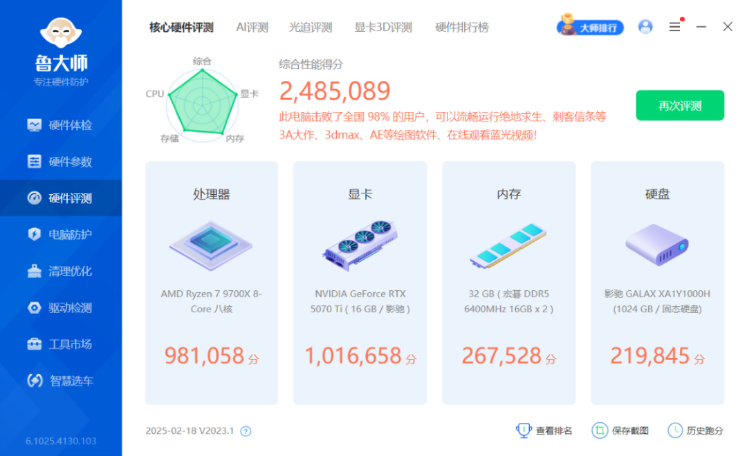 魯大師整機測試得分248.5W分,顯卡得分101.6W分;