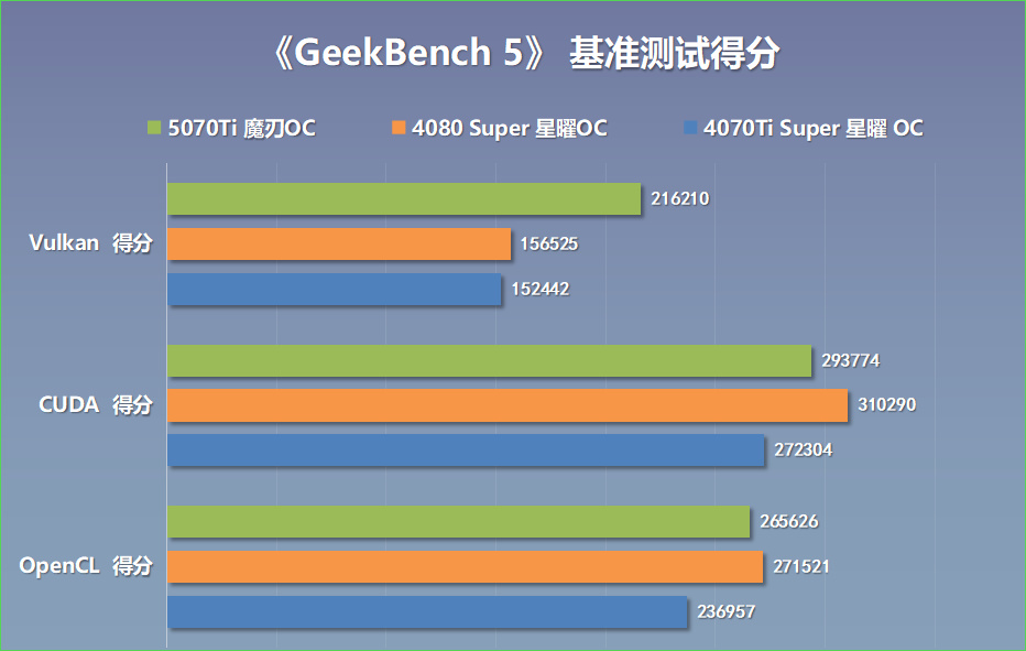 通過GeekBench 5顯卡測試,我們可以測試出顯卡在處理不同的GPU硬件加速計算模型時的性能表現。在OpenCL測試中,顯卡得分265626分。在CUDA測試中,顯卡得分293774分。在Vulkan測試中,顯卡得分216210分;