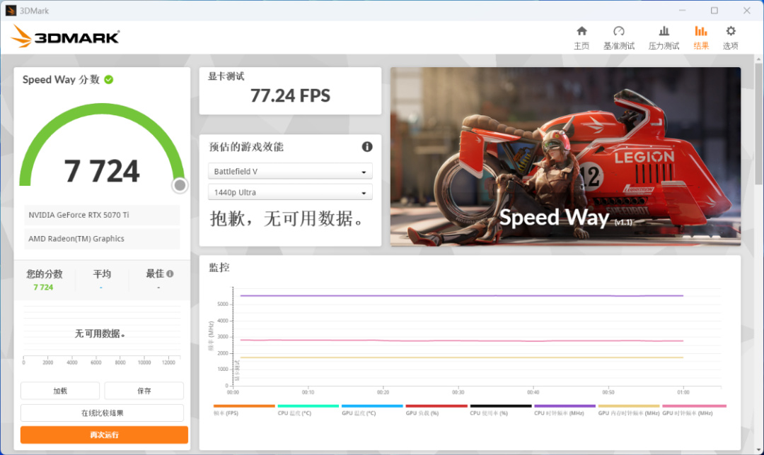 Speed Way基準測試可以測試出顯卡等硬件在基於DirectX 12 圖形API中,渲染實時光追、網格着色器等場景時的性能表現。RTX 5070Ti魔刃OC 顯卡得分7724分;