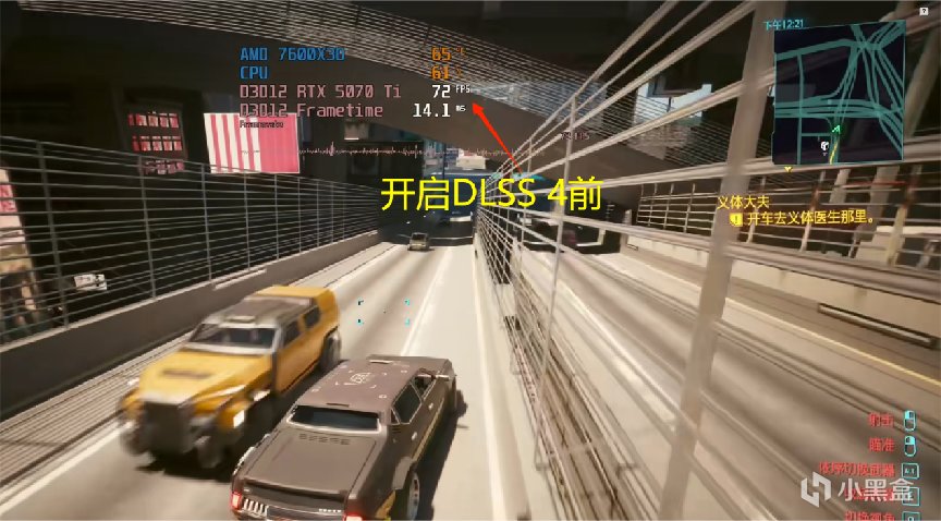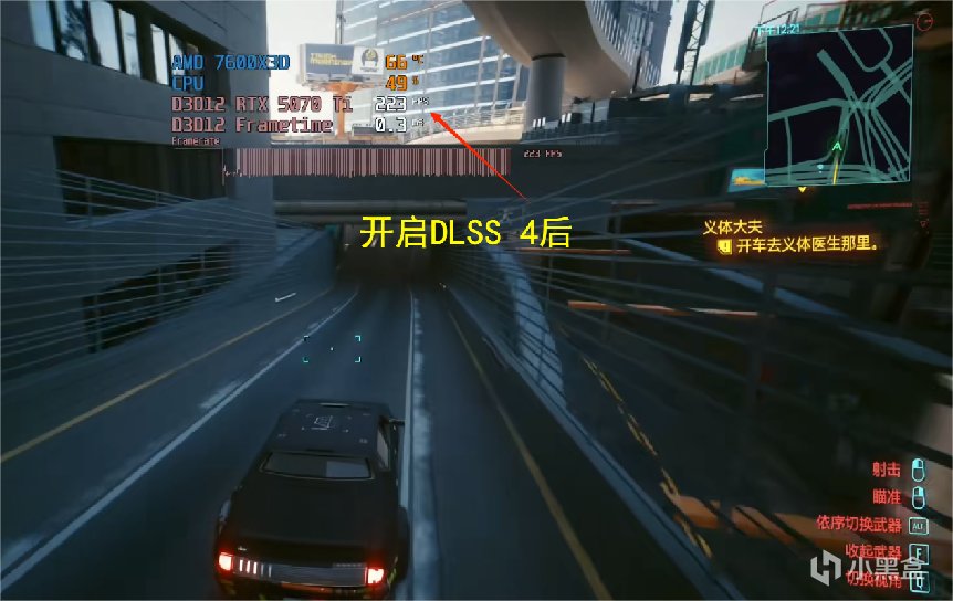如果你覺得口味稍微有點輕那我們看看RTX50系列的獨門絕技:“拼好幀”---DLSS 4,目前已經實裝DLSS 4的遊戲分別是賽博朋克2077,我們在2K分辨率下將所有特效全開,可以看到目前幀數僅有70-80,而在開啓DLSS 4後,幀數直接翻了3倍,來到了210-230,在實際的遊戲也絲毫沒有延遲感。