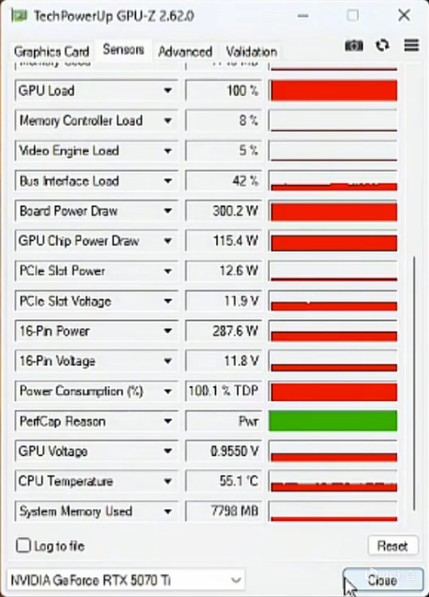 最後我們測了一下5070 Ti在GPU+顯存雙重烤機下的軟顯功耗,峯值差不多是穩定300W,而在七彩虹「超・旋渦」散熱系統加持下核心溫度和顯存溫度都到了一個令人滿意的程度。